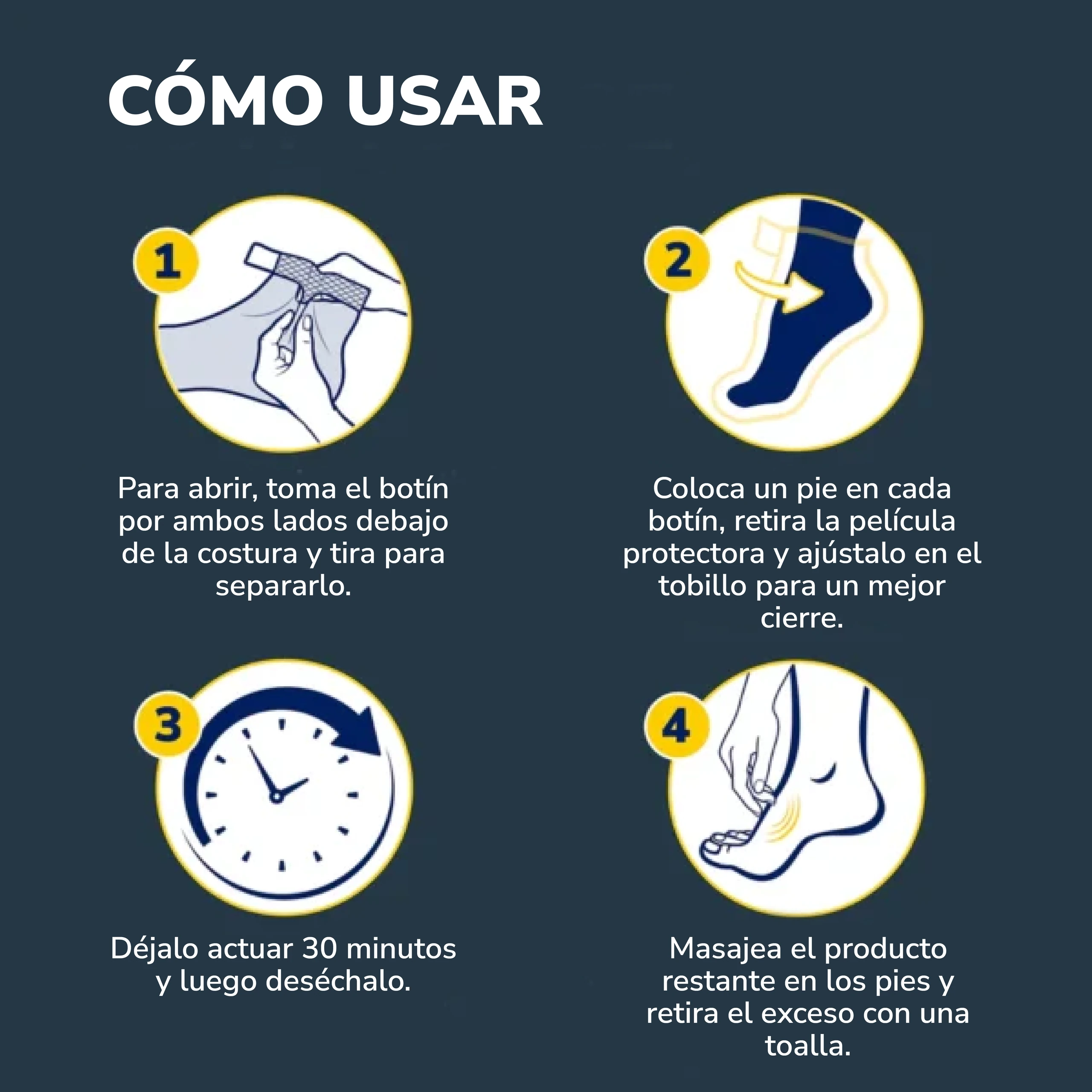 - PASO 4: Retire los botines después de 30 minutos y deséchelos. Masajee suavemente el resto del tratamiento en los pies y luego retire el exceso de producto.