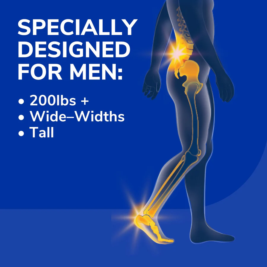- Especialmente diseñado para hombres de más de 200 libras, altos y/o aquellos con pies anchos.